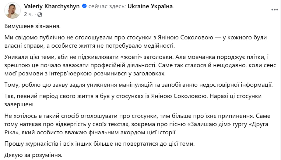 За інформацією зі сторінки Валерія Харчишина в Facebook, музикант зробив "вимушене зізнання", пояснивши, що мовчання щодо стосунків спричинило плітки та навіть почало заважати професійній діяльності.