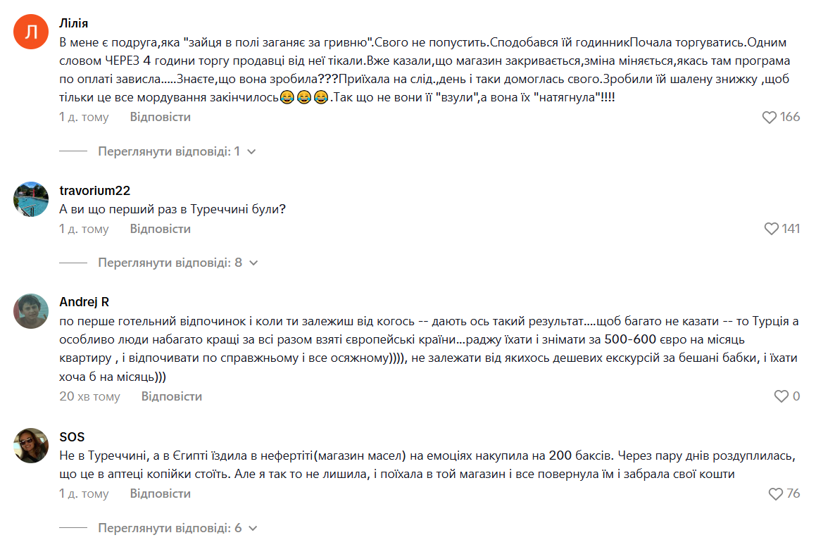 - "Я теж така наївна. Думала, підвезуть у місто, побігаю по турецьких базарчиках. А ні, не вийшло. Нас як баранів загнали у їхній торговий центр з захмарними цінами, водій як сторож в тюрмі ходив і наглядав за нами. Я зрозуміла, що щось не те і нічого не купувала. Думала, в готель вже не доїду".