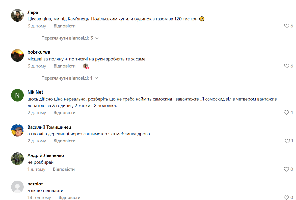 Жінка, яку звуть Валерію, розповіла свою історію. "Цікава ціна, ми під Кам'янець-Подільським купили будинок з газом за 120 тис грн", – поділилась вона. Чоловік, підписаний як "Мельник", опублікував фотографію сірників, натякаючи, що простіше спалити хату.