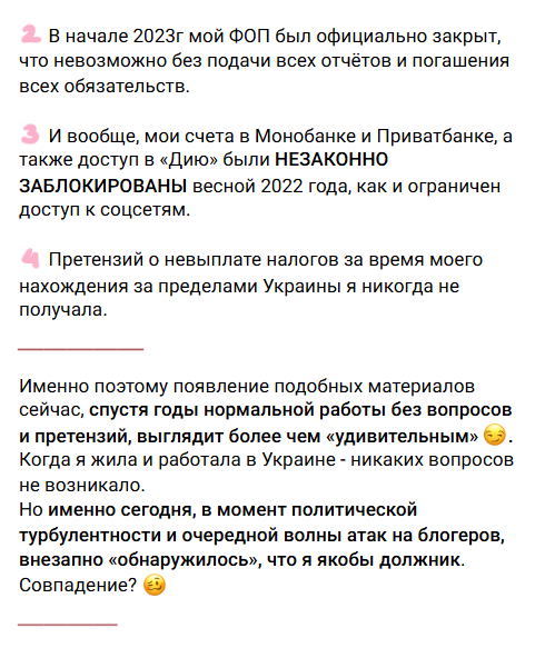 Блогерка також навела деякі дані щодо своєї підприємницької діяльності, яку вела під час перебування на території України. За її словами, з 2018 по 2022 роки блогерка вела діяльність як ФОП 3 групи оподаткування, в ході якої нібито сплачувала податки у цілковитому обсязі.