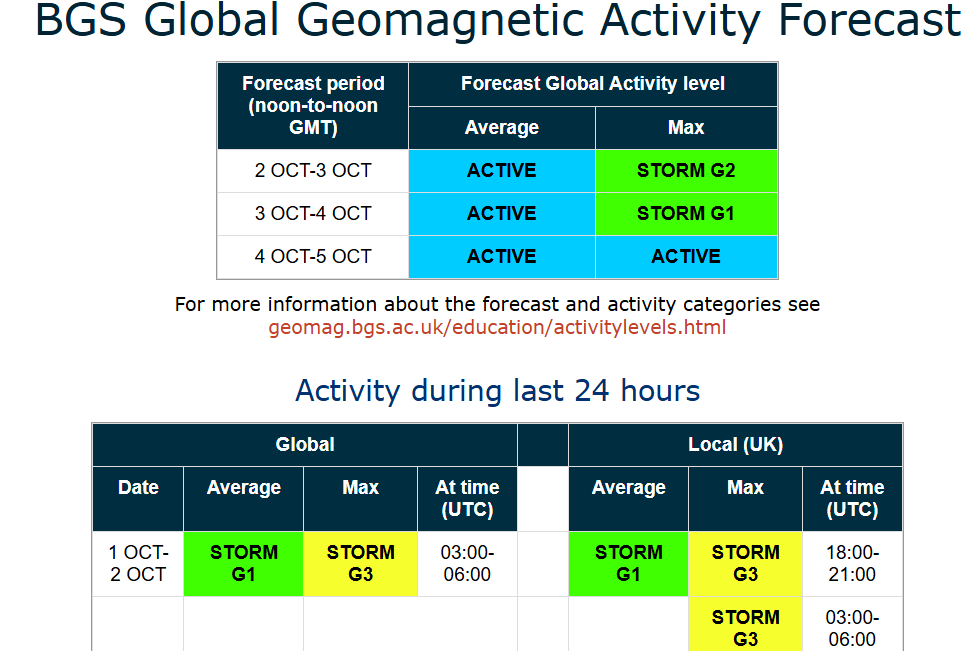 3 жовтня рівень магнітних бур знижується до жовтого (4 бали), а 4-го стає зеленим (0,7 бала).