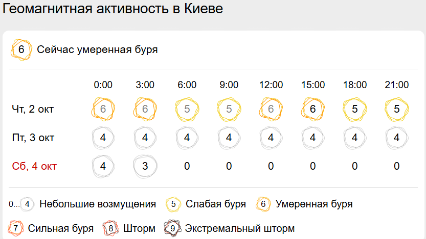 2 жовтня в Києві — помірна магнітна буря в 6 балів, яка після 18:00 знизиться до 5 балів, а 3 жовтня буде на рівні 4 балів.