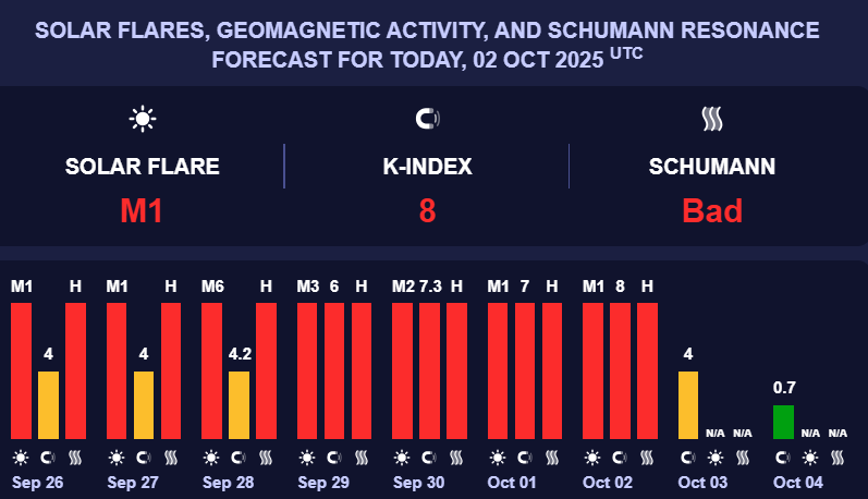 У період з 3 по 5 жовтня очікуються висока сонячна активність і магнітні бурі з максимальним показником у 6 балів 2-3 жовтня, і 5 балів — 4 жовтня. У неділю, 5 жовтня, ситуація стабілізується.