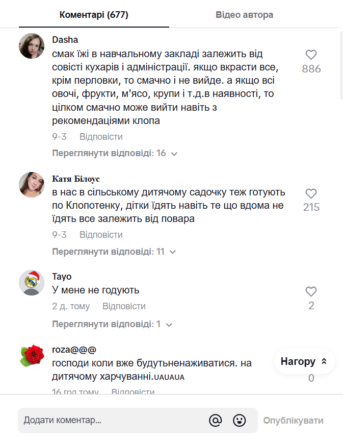 - "У нас в сільському дитячому садочку теж готують по Клопотенку, дітки їдять навіть те, що вдома не їдять. Усе залежить від повара", — додає інша;