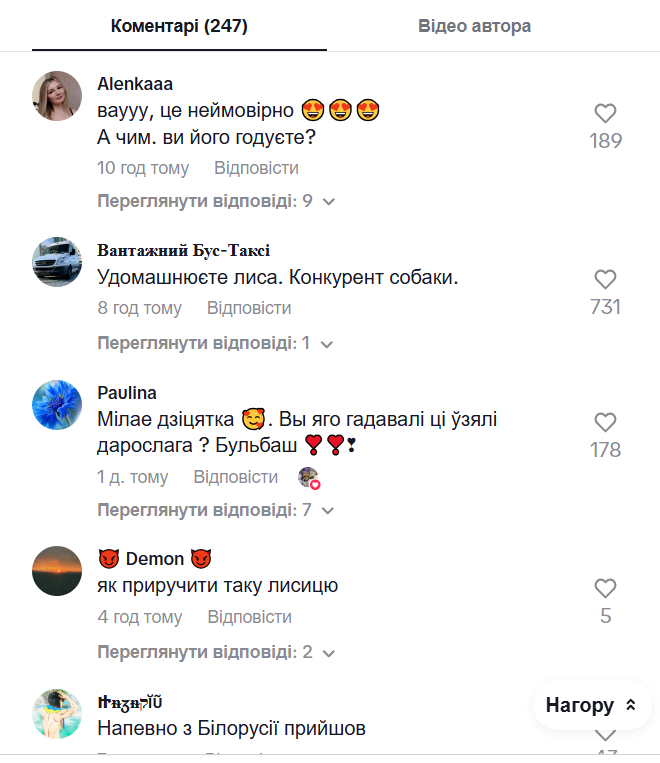 Одна з глядачок поділилась схожою історією: "Я майже в центрі Львова позавчора лиса бачила. Йшла додому близько одинадцятої вечора. Вона на мене подивилась, пішла нагадала на дитячий майданчик і далі по справах пішла".