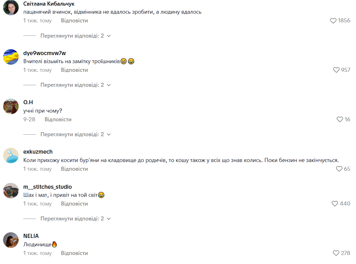 Одна з глядачок написала: "Ще такої теми в TikTok не бачила". Це відео зібрало пів мільйона переглядів, понад 15 тисяч вподобайок, коментарів, репостів та інших реакцій.