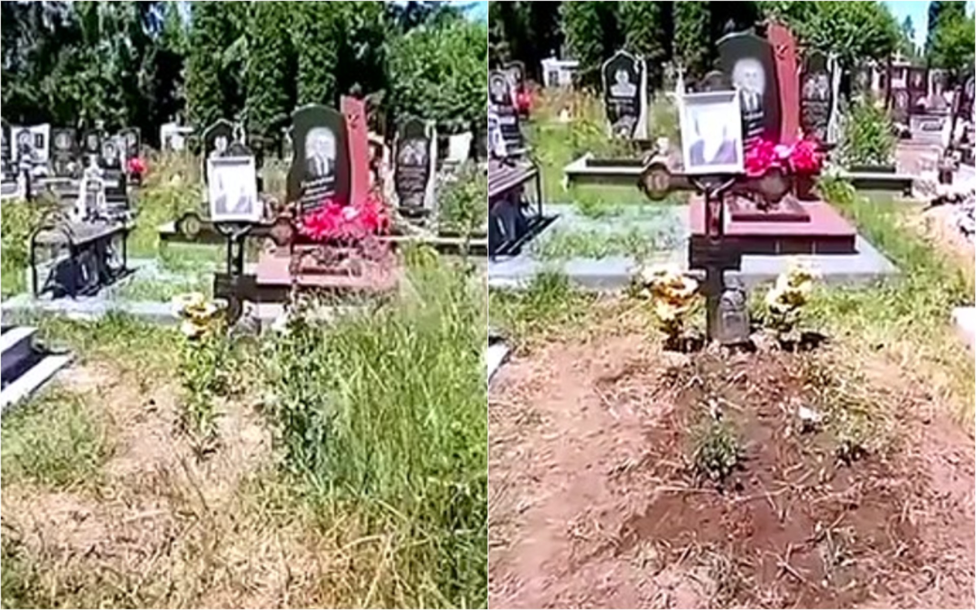 Далі він взявся до роботи: викосив траву та бур’яни, поставив по боках штучні квіти, а також полив саджанці безпосередньо на могилі. Результат помітно неозброєним оком, однак, можливо, не так ідеально, як хотілося б.