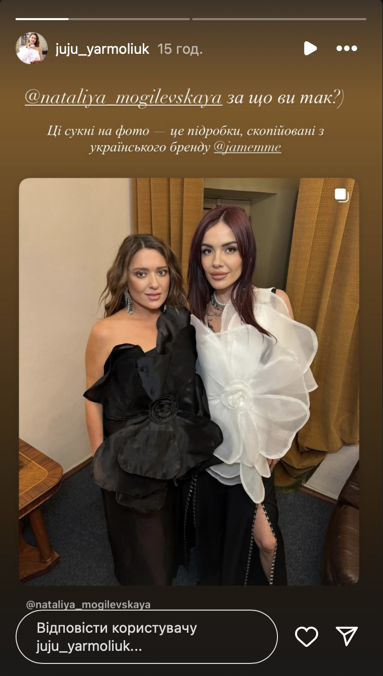 "Наталія Могилевська, за що ви так? Ці сукні на фото — це підробки, скопійовані з українського бренду J’amemme", — наголосила засновниця бренду, який носять зокрема світові зірки.