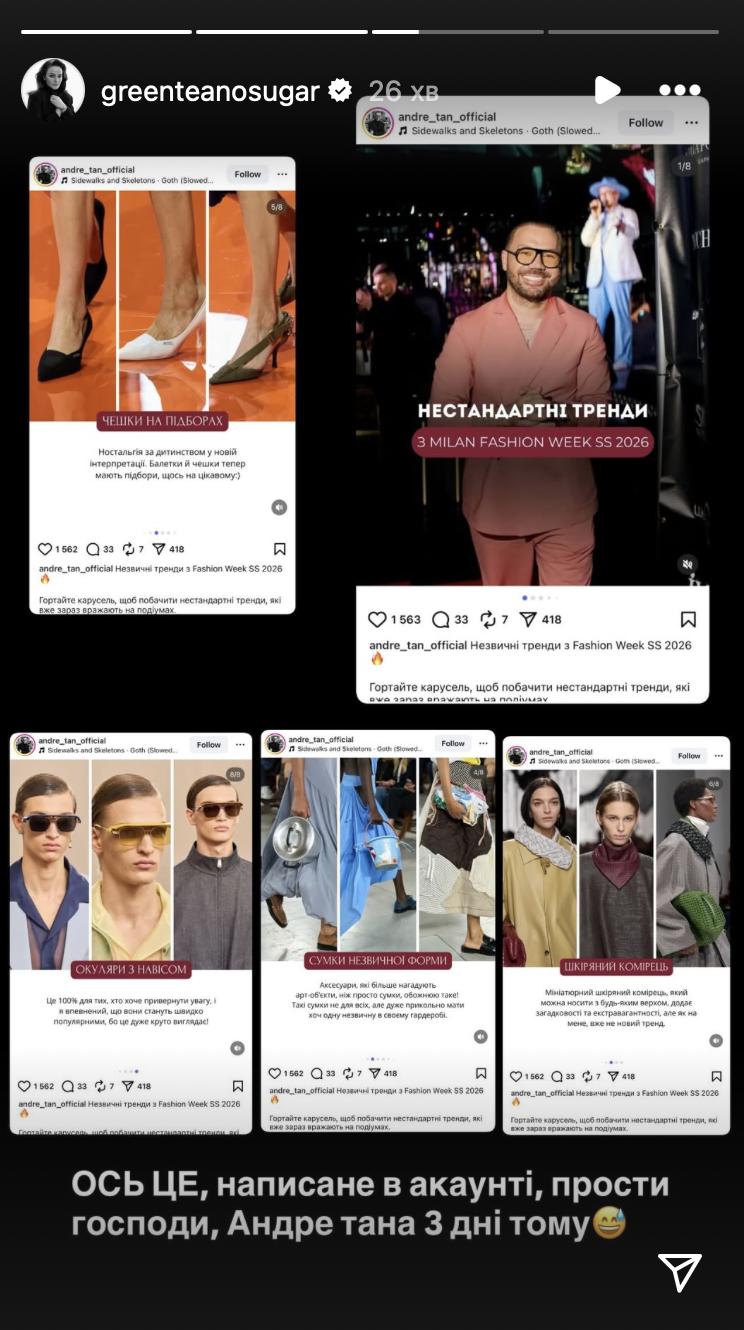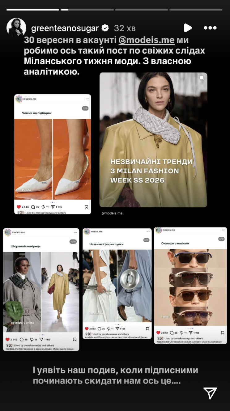 "Отже, цікава ситуація. 30 вересня ми робимо ось такий пост по свіжих слідах Міланського тижня моди. З власною аналітикою. І уявіть наш подив, коли підписники починають скидати нам ось це…" — написала стилістка.
