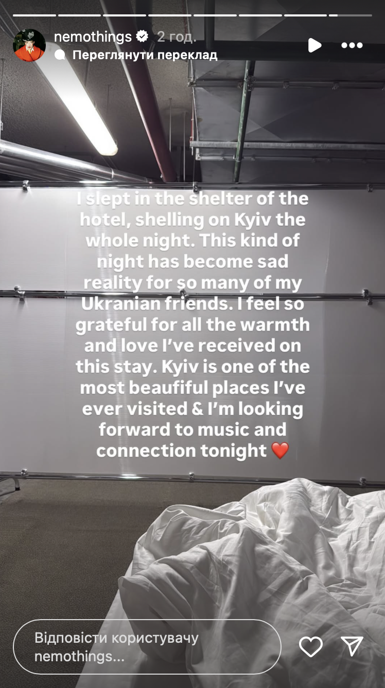 Вдень 10 жовтня Nemo вийшов на звʼязок. Через терористичну атаку росіян їм довелося ночувати в укритті готелю. Музиканти щиро подякували усім людям, які були поруч та підтримали їх під час атаки.