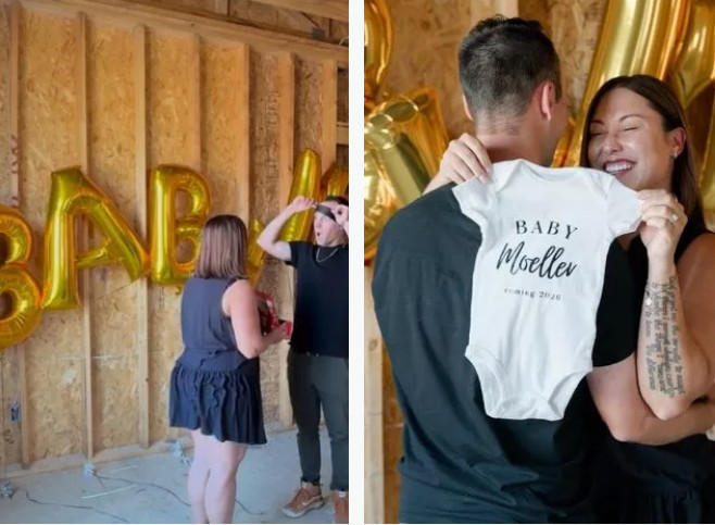 На іншому фото Метт був із зав’язаними очима, коли дружина вела його до будівлі, де на нього чекали повітряні кульки, крихітні дитячі кросівки та позитивний тест на вагітність.