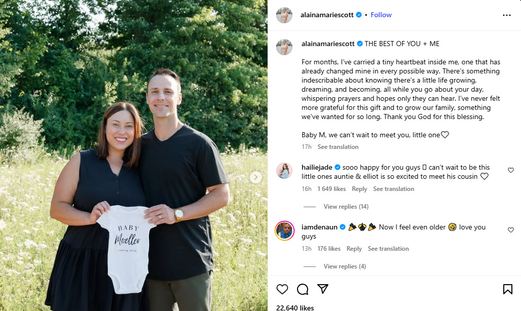 Метт Моллер відповів у коментарях: "Бог благословив нашу сім’ю дивом життя. Малюк ще не знає, як йому пощастило мати таку маму, як ти, але він це зрозуміє. Я люблю тебе і люблю нашого малюка М".
