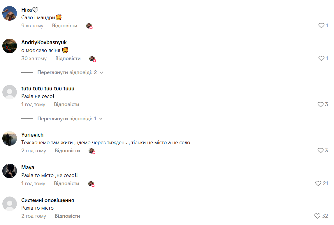 - Інша додала: "Теж хочемо там жити, їдемо через тиждень, тільки це місто, а не село";
