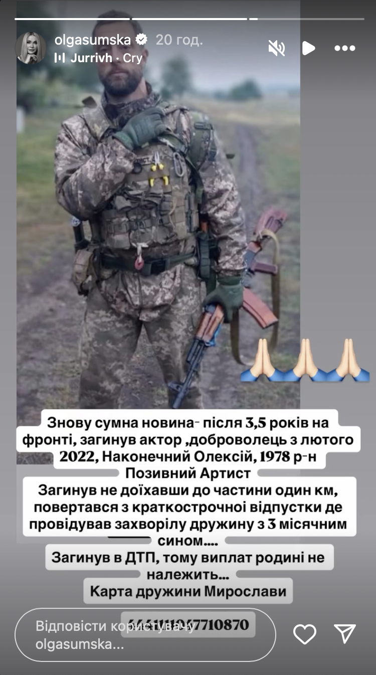"Загинув, не доїхавши до частини один кілометр. Повертався з короткострокової відпустки, де провідував захворілу дружину з тримісячним сином. Загинув у ДТП, тому виплат родині не належить…" — зазначила Сумська, додавши карту дружини воїна для допомоги.