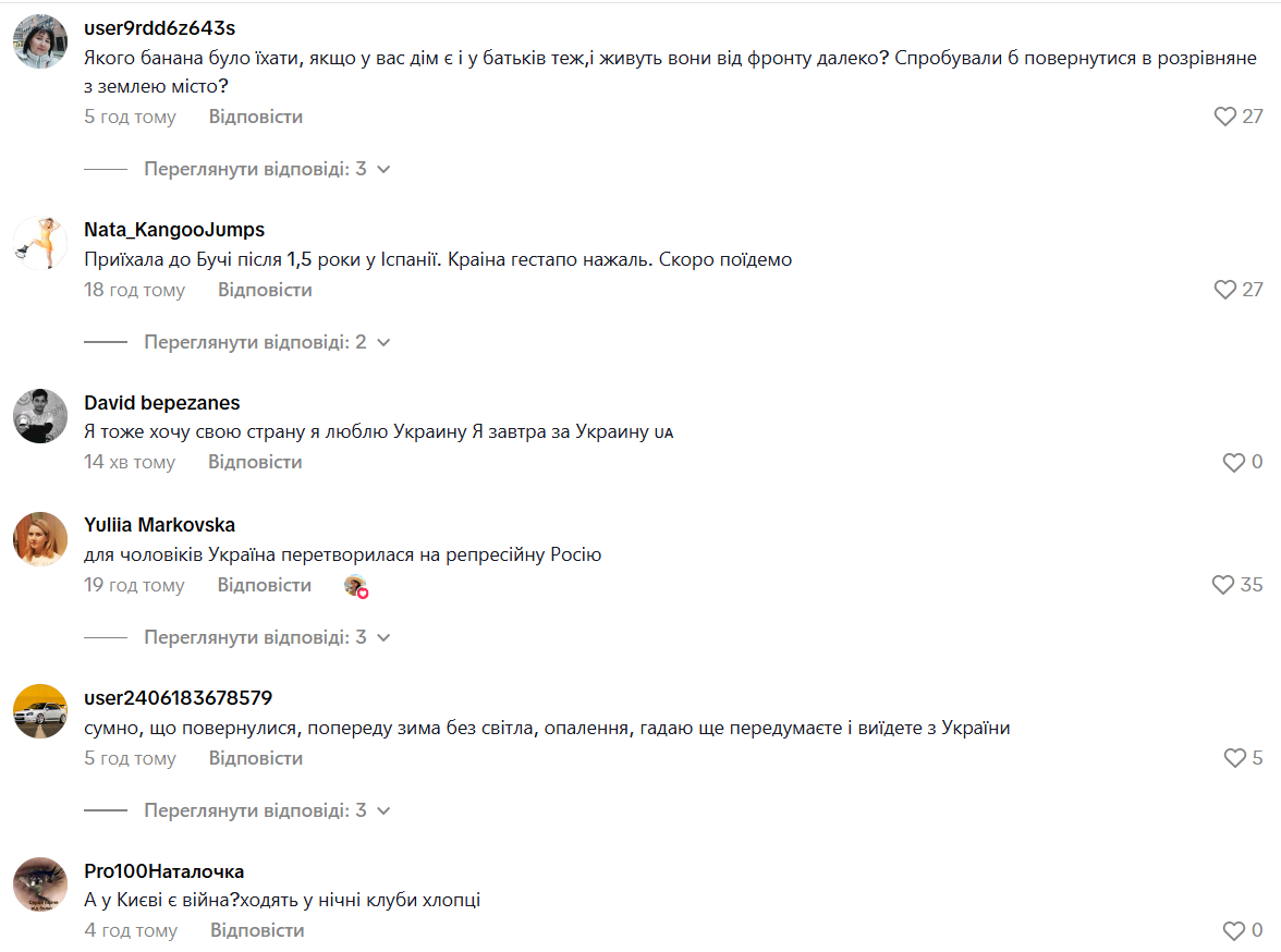 "Приїхала до Бучі після 1,5 роки в Іспанії. Країна гестапо, на жаль. Скоро поїдемо", — зауважила наступна учасниця обговорення. Інша користувачка розповіла свою історію: "Поки що не жалкую, два роки плюс тому повернулися з Німеччини в Миколаїв. Дай Боже, щоб все стало добре".