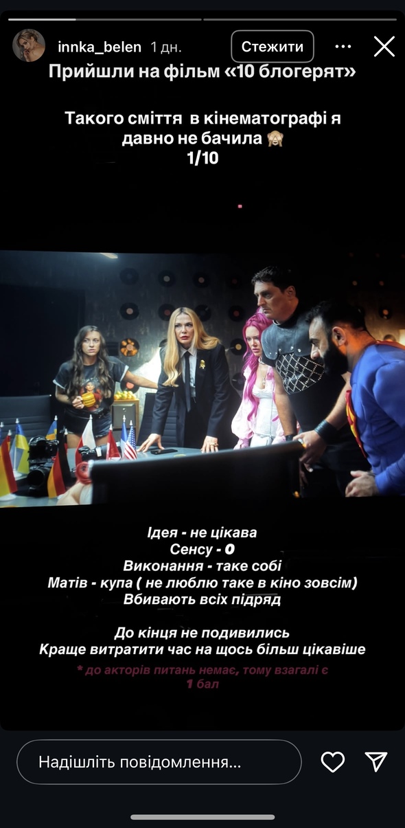 29-річна переможниця 13 сезону шоу «Холостяк» і волонтерка з Харкова Інна Бєлєнь опублікувала жорсткий відгук на фільм "10 блогерят", в якому одну з головних ролей виконав ветеран і блогер Олександр Терен. Вона поділилась, що її бойфренд навіть заснув під час перегляду.