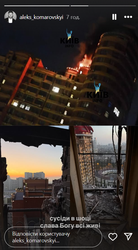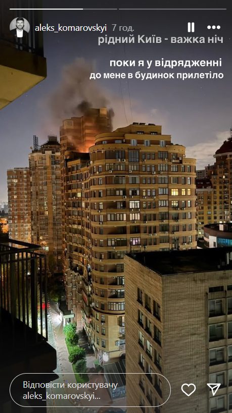 "Рідний Київ. Важка ніч. Поки я у відрядженні — до мене у будинок прилетіло. Сусіди шоковані. Слава Богу, всі живі", — написав Комаровський.