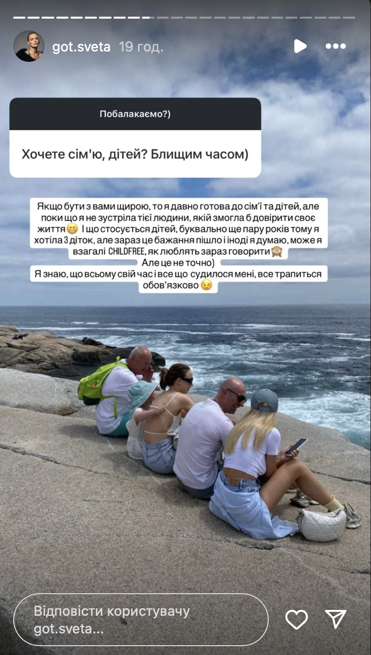 "Якщо бути з вами щирою, то я давно готова до сімʼї та дітей, але поки що я не зустріла тієї людини, якій змогла б довірити своє життя. І що стосується дітей, буквально ще декілька років тому я хотіла трьох діток, але зараз це бажання пішло. Але це не точно. Я знаю, що всьому свій час і все, що судилося мені, все трапиться обов’язково", — зазначила бізнесвумен.
