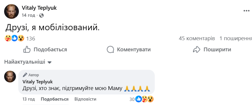У коментарях під дописом Теплюк звернувся до підписників із проханням підтримати його матір.