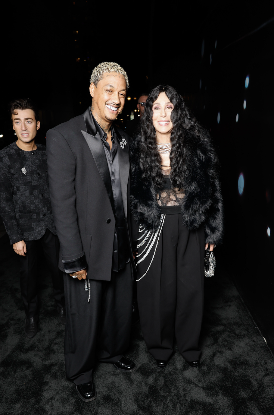 Шер міцно обійняла свого хлопця, який виглядав ошатно, одягнувши блейзер з атласним лацканом та штани. Його коротке кучеряве текстуроване волосся було знебарвлене з темним корінням, і вони з Шер трималися поруч, коли прибули на вечірку, де було багато зірок.