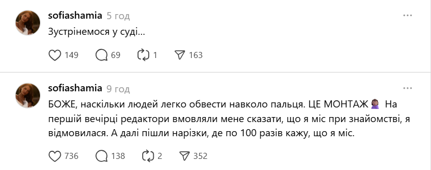 "БОЖЕ, наскільки людей легко обвести навколо пальця. ЦЕ МОНТАЖ. На першій вечірці редактори вмовляли мене сказати, що я міс при знайомстві, я відмовилася. А далі пішли нарізки, де по 100 разів кажу, що я міс", — пише Софія.
