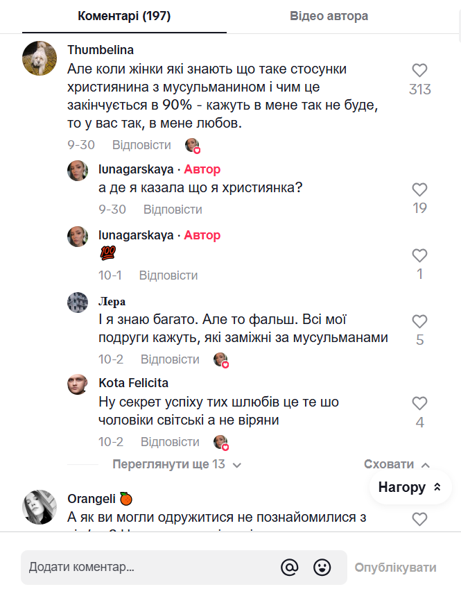 - "Ну це не здивування. Зовсім інша нація, інші стандарти та традиції. Це важка праця мати взагалі стосунки, а якщо ще й іноземець, то ще важче, але це особистий вибір кожного. Але завжди потрібно вибирати себе".