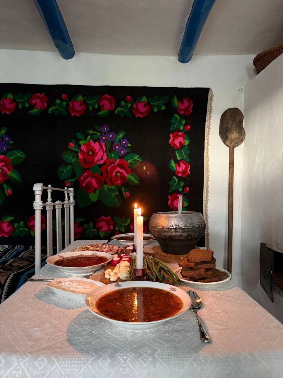 У їхній хаті панує справжня українська атмосфера: на столі — домашній борщ, чорний хліб і часник. Подружжя каже, що мали на меті створити місце, де поєднуються пам’ять, традиція та спокій.