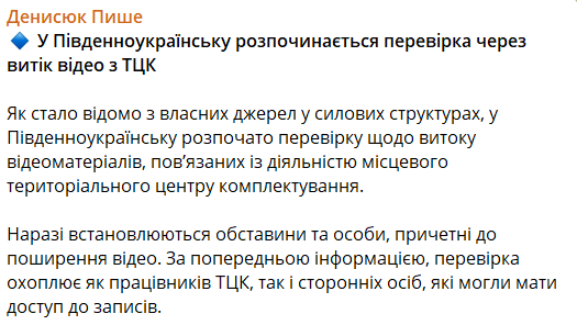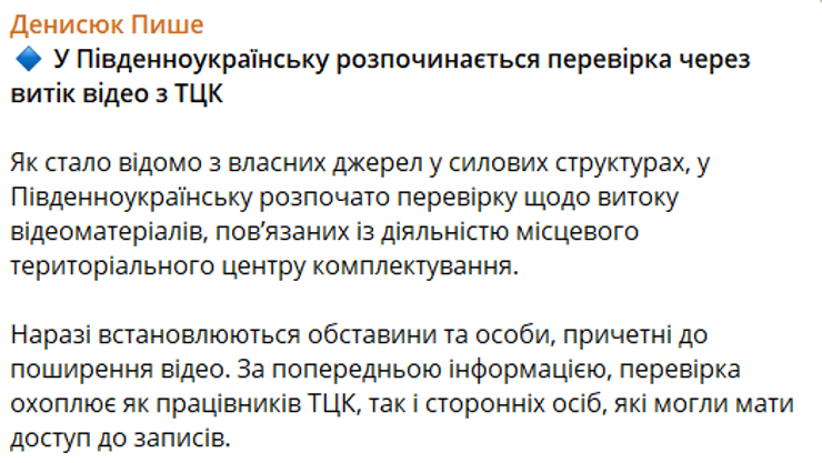 "Наразі встановлюються обставини та особи, які мають відношення до поширення відео. За попередньою інформацією, перевірка охоплює як працівників ТЦК, так і сторонніх, які могли мати доступ до записів", — написав він.