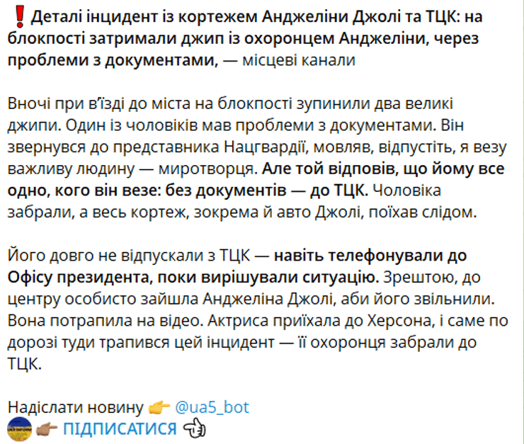 "В одного з чоловіків були проблеми з документами. Він звернувся до представника Нацгвардії, мовляв, відпустіть, я везу важливу людину — миротворця. Але той відповів, що йому все одно, кого він везе: без документів у ТЦК. Чоловіка забрали, а весь кортеж, зокрема й авто Джолі, поїхав слідом. Його довго не відпускали з ТЦК — навіть телефонували до Офісу президента, поки вирішували ситуацію. Зрештою, до центру особисто зайшла Анджеліна Джолі, щоб його звільнили", — ідеться в публікації.