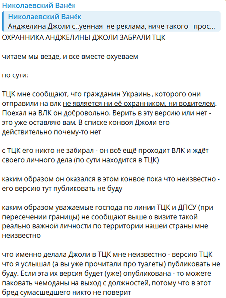 "ТЦК мені повідомляють, що громадянин України, якого вони відправили на ВЛК, не є ні її охоронцем, ні водієм. Поїхав на ВВК він добровільно. Вірити в цю версію чи ні — це вже залишаю вам. У списку конвою Джолі його дійсно чомусь немає. З ТЦК його ніхто не забирав — він усе ще проходить ВЛК і чекає на свою особову справу (по суті перебуває в ТЦК). Яким чином він опинився в цьому конвої, поки що невідомо, його версію тут публікувати не буду. Яким чином шановні панове по лінії ТЦК і ДПСУ (під час перетину кордону) не повідомляють вище про візит такої реально важливої особи територією нашої країни, мені невідомо", — пише він.