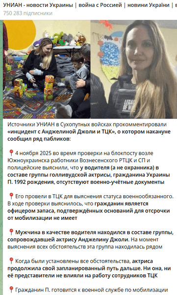"З Анджеліною Джолі все нормально, вона дійсно відвідала ТЦК і СП. Заїхала і попросилася в туалет. Щодо її охоронця — це офіцер запасу. Насильно його ніхто не затримував. Його запросили для відвідування ТЦК і СП. Встановили його особу, після чого він спокійно поїхав у своїх справах. Проблемних питань не виникало. Усе в межах закону", — повідомляють журналісти з посиланням на високопоставлене джерело в командуванні Сухопутних військ ЗСУ.