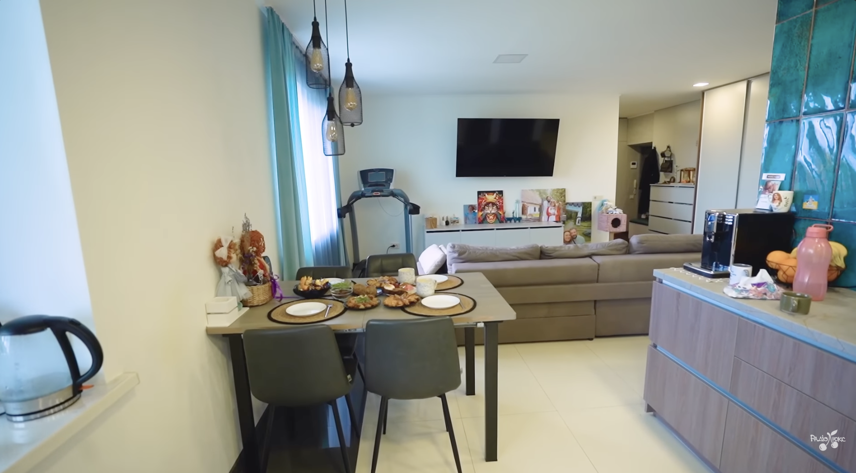 У вітальні є великий світлий диван, телевізор, комод та бігова доріжка, яку після продажу акторка не буде забирати з квартири. Також Юлія показала подарунки від фанатів: в'язані іграшки і картини.