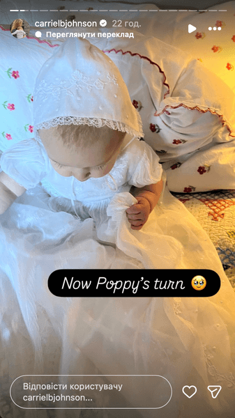 Дружина колишнього прем'єр-міністра Великої Британії Бориса Джонсона Керрі оголосила про важливу подію в родині. Вони з чоловіком похрестили свою наймолодшу дитину, дівчинку Поппі.