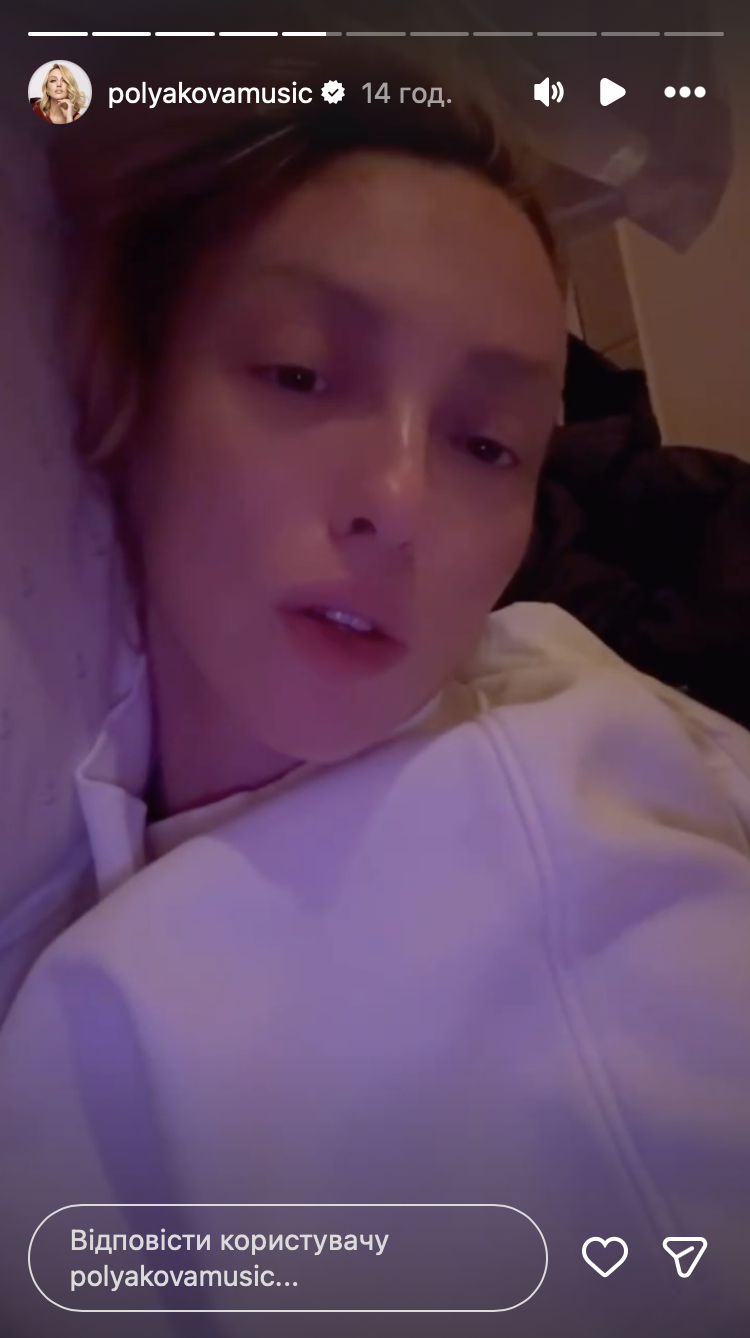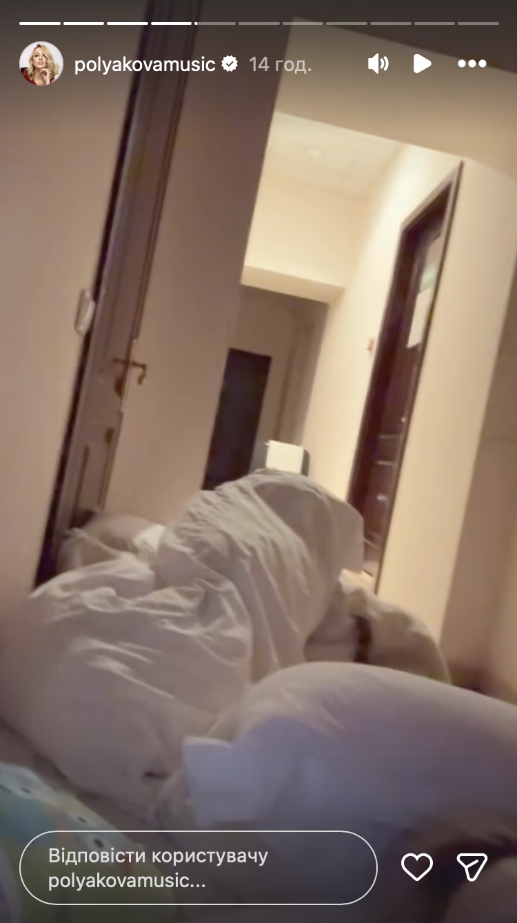 "Ну що, пупсики, щоб ви розуміли — я у себе в підвалі. У мене тут матраци на підлозі. Тут трошки страшно, але я думаю, що на п'ятому поверсі страшніше. Всім нам здоров'я", — звернулася Оля Полякова до підписників.