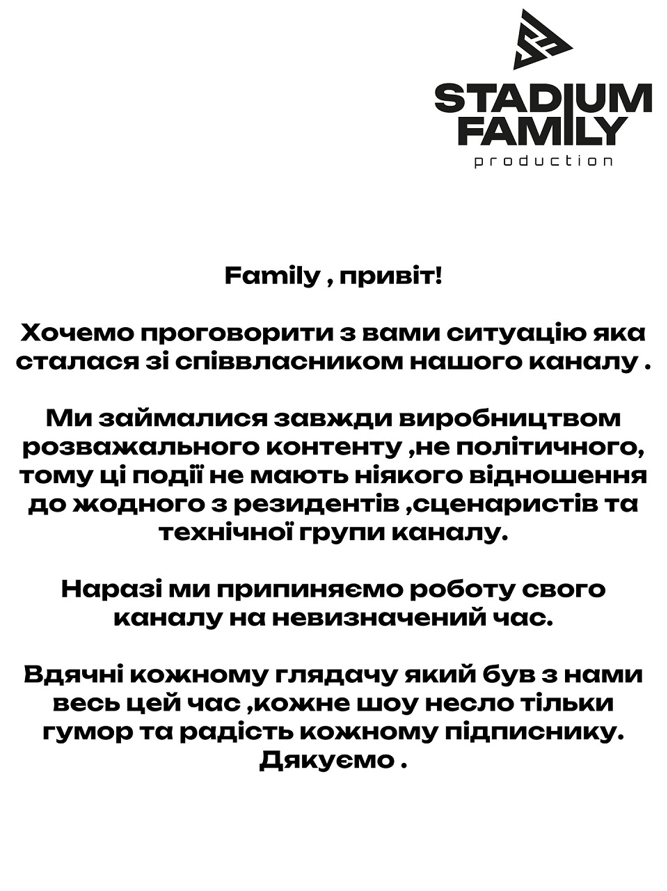 "Ми займалися виробництвом завжди розважального контенту, не політичного, тому ці події не мають жодного стосунку до жодного з резидентів, сценаристів і технічної групи каналу. На цей момент ми припиняємо роботу свого каналу на невизначений час", — ідеться в повідомленні.