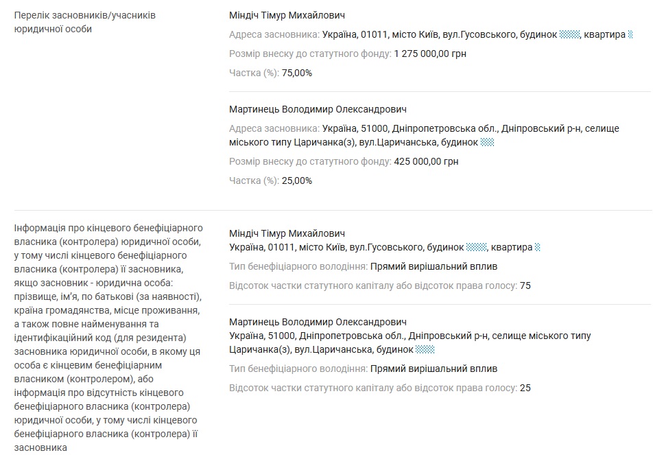 Згідно з даними YouControl, власниками компанії "Стедіум Фемілі" (ТОВ "СТЕДІУМ ФЕМІЛІ") є Тимур Міндіч (75% частки) і Володимир Мартинець (25% частки).