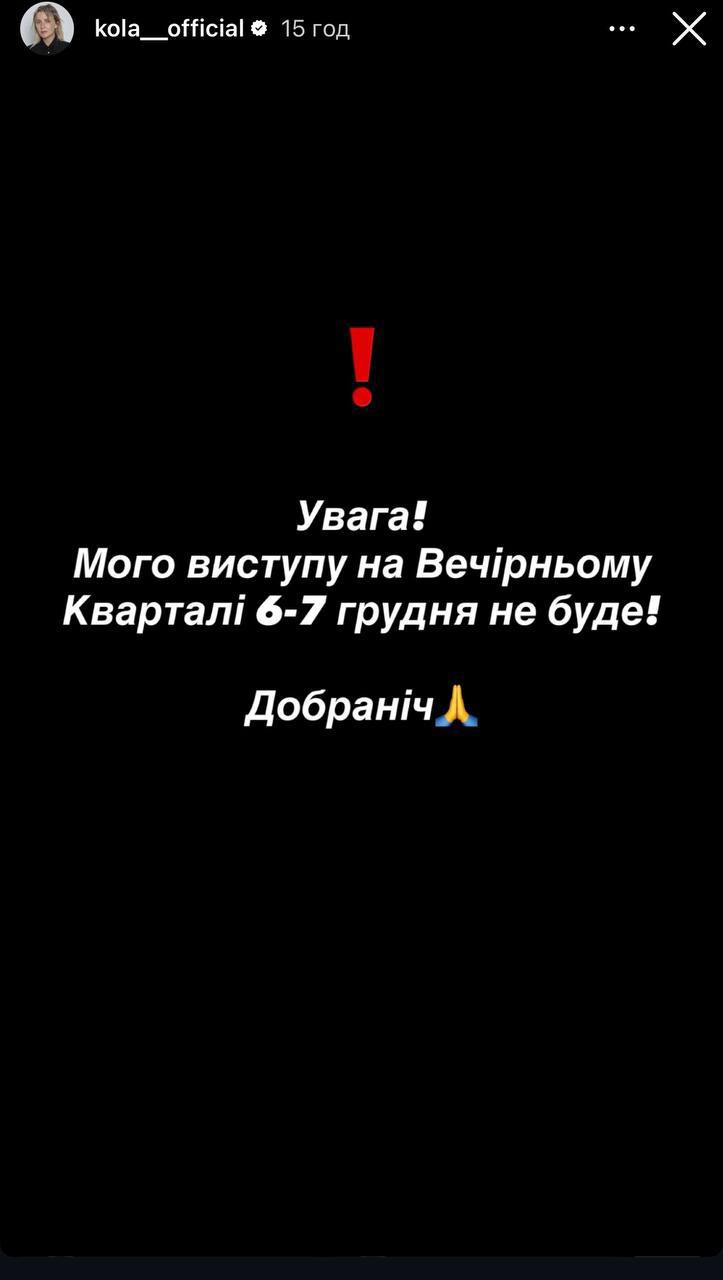 "Увага! Мого виступу на Вечірньому Кварталі 6 та 7 грудня не буде! Добраніч", — написала співачка.
