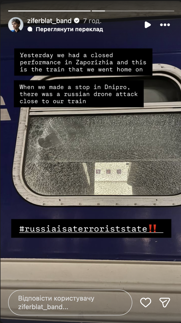 "Учора (17 листопада, — Ред.) в нас був закритий концерт у Запоріжжі, і ось цим поїздом ми поверталися додому. Коли ми зупинилися у Дніпрі, поруч із нашим поїздом сталася атака російського безпілотника", — написали артисти.