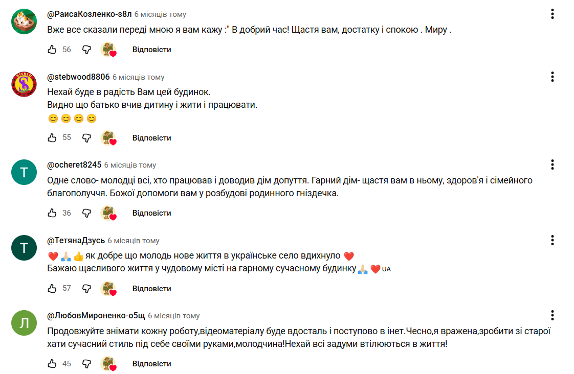 Глядачка Лідія написала: "Обожнюю дивитись такі відео. Радію за молодь, яка не боїться труднощів і відновлюють звичайні сільські хати в сучасні, комфортні будинки. Щастя вам і натхнення, щоб закінчити все, що задумали".