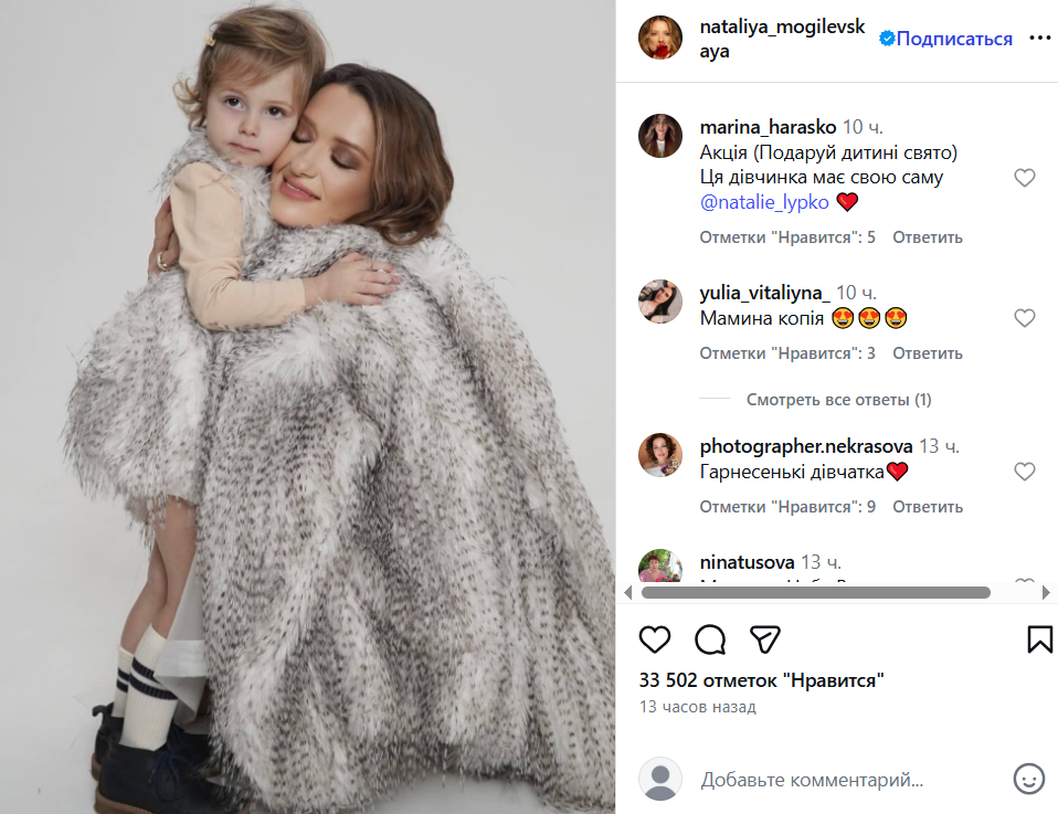На фото, яке Наталія Могилевська опублікувала в Instagram, мати й дочка позують в обіймах. Це перший знімок, на якому п'ятирічна Софія стоїть обличчям до об'єктива. До цього співачка приховувала обличчя дівчинки, знімаючи її зі спини.
