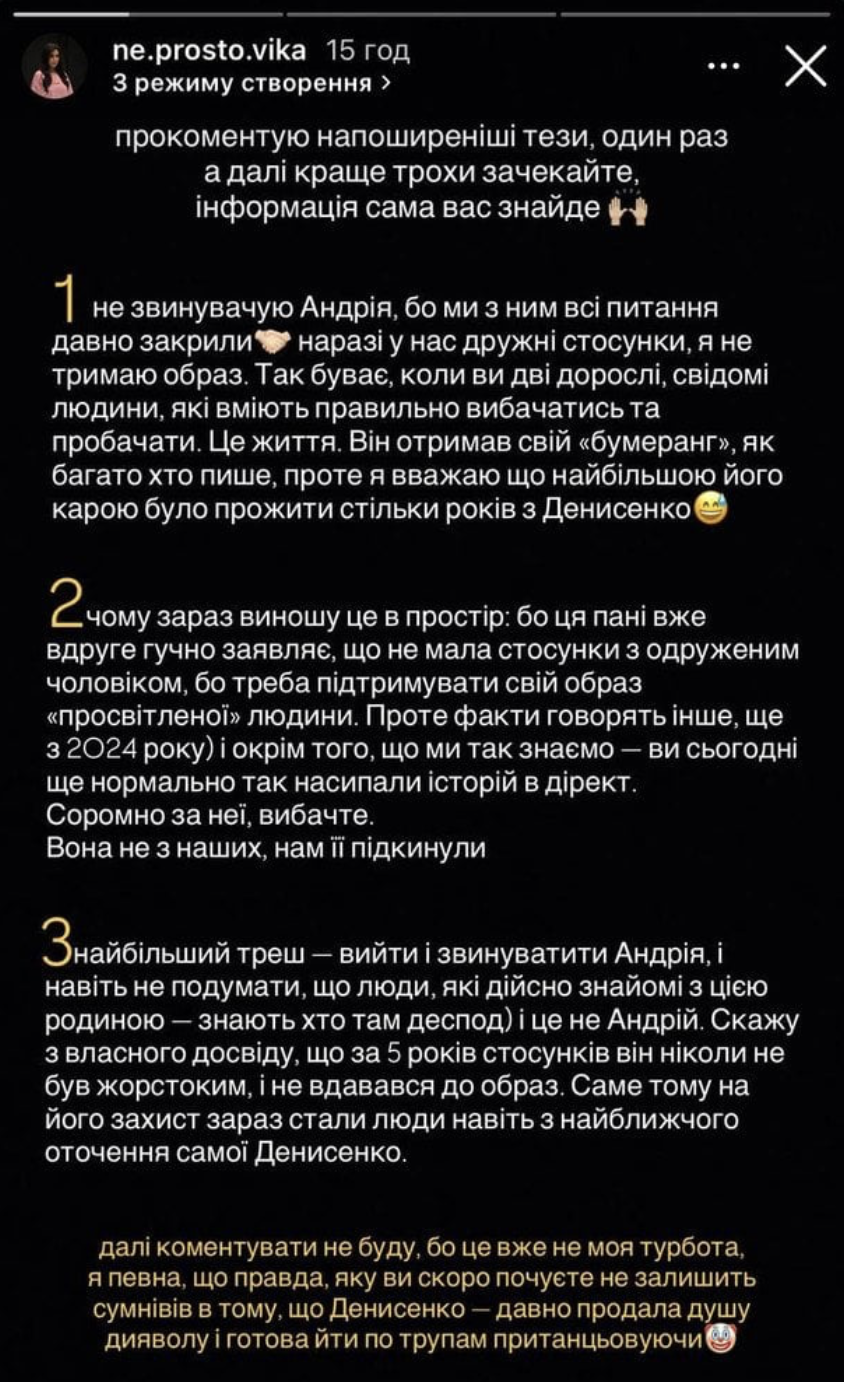 "Не звинувачую Андрія, бо ми з ним всі питання давно закрили… Він отримав свій "бумеранг", як багато хто пише, проте я вважаю, що найбільшою його карою було прожити стільки років з Денисенко", — написала Вікторія, яка є операційною менеджеркою G×Bar.