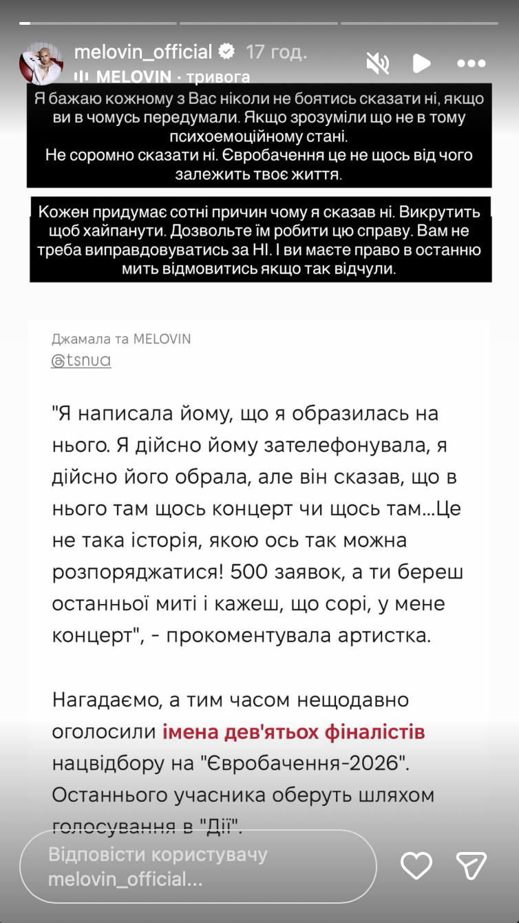 "Я бажаю кожному з Вас ніколи не боятись сказати ні, якщо ви в чомусь передумали. Якщо зрозуміли що не в тому психоемоційному стані. Не соромно сказати ні. Євробачення це не щось від чого залежить твоє життя", — написав Меловін.