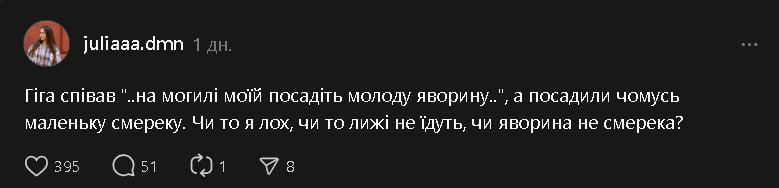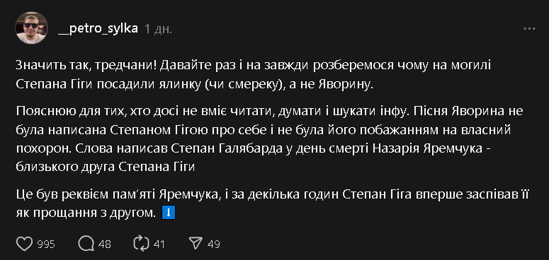Окремо один із користувачів Threads детально пояснив, чому на могилі Степана Гіги з’явилася саме ялина. За його словами, пісня "У райському саду" не була написана про самого співака і не містила його побажань щодо поховання. Слова до неї Степан Галябарда створив у день смерті Назарія Яремчука, а назва "Яворина" закріпилася вже згодом, коли пісня стала відомою в народі.