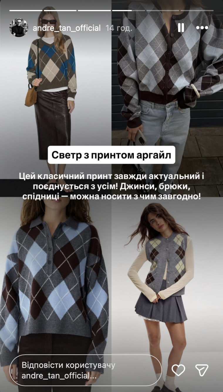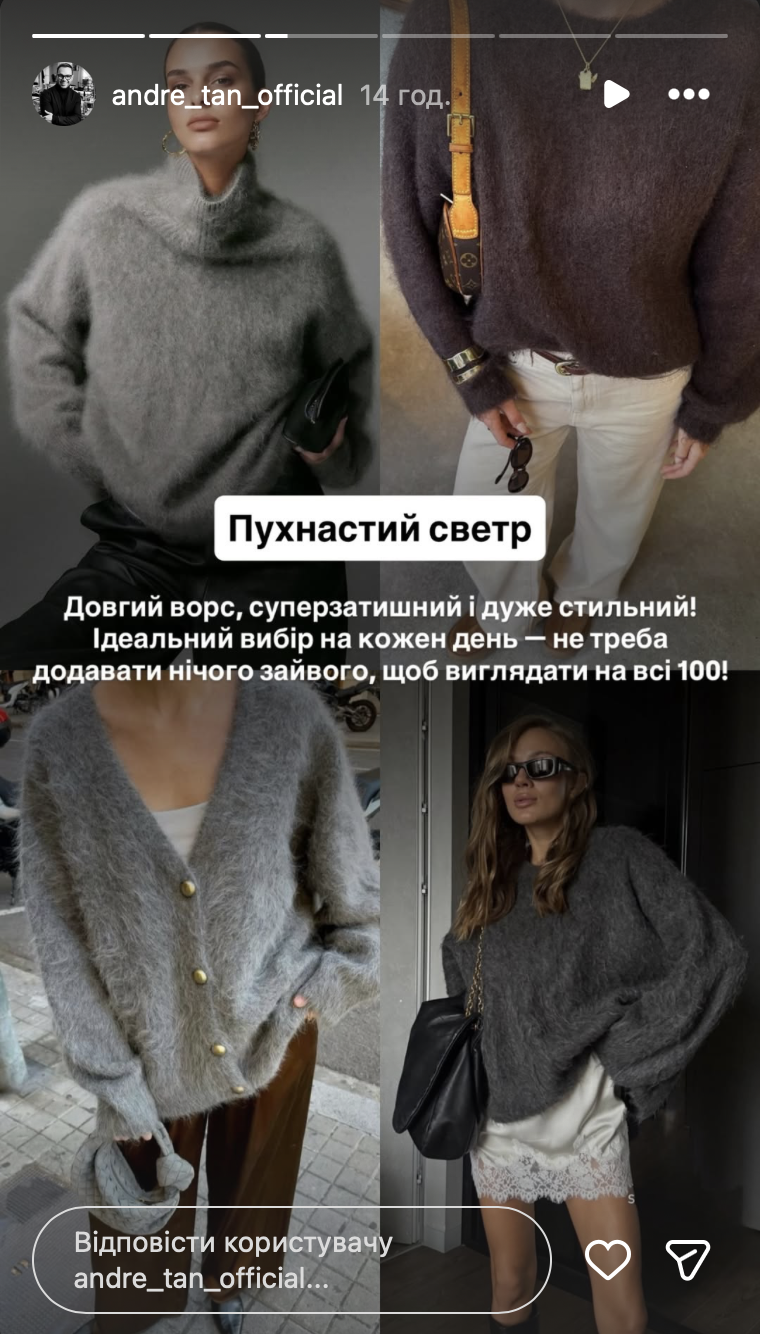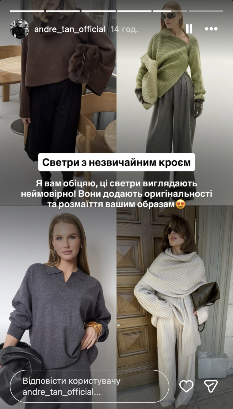 У своєму Instagram метр моди показав, які светри носити цього холодного сезону. "Дорогенькі, зима вже в самому розпалі, тож саме час підготуватися до стильних холодів! Сьогодні я поділюсь з вами найстильнішим светрами, які додадуть вашому зимовому образу неперевершеного вигляду!" — написав Андре Тан.