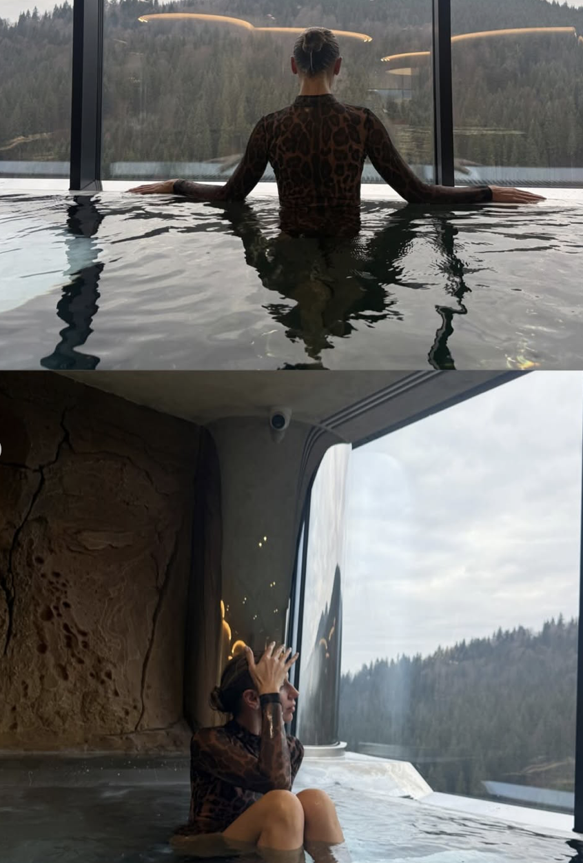Ведуча шоу "Хто зверху?" похизувалася стрункими та довжелезними ногами в басейні коло панорамного вікна в суцільному купальнику у хижий принт. Леся зізналася, що цей готель тільки відкрився, а вона вже отримала змогу стати однією з перших гостей.