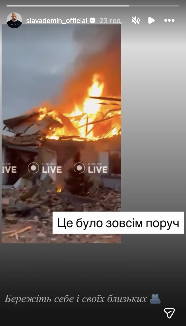 Зокрема, ведучий показав кадри з місця трагедії, на яких видно охоплений вогнем будинок після російського удару. Слава також звернувся до прихильників із закликом бути максимально обережними та берегти себе й рідних під час масованих обстрілів.