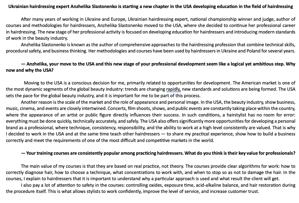 Після багаторічної роботи в Україні та Європі українська перукарська експертка, призер та суддя національних чемпіонатів, автор курсів та методологій для перукарів — Анжеліка Сластьоненко переїхала до США, де вирішила продовжити свою професійну кар’єру у сфері перукарського мистецтва. Новий етап її професійної діяльності зосереджений на розвитку освіти для перукарів та впровадженні сучасних стандартів роботи в індустрії краси.