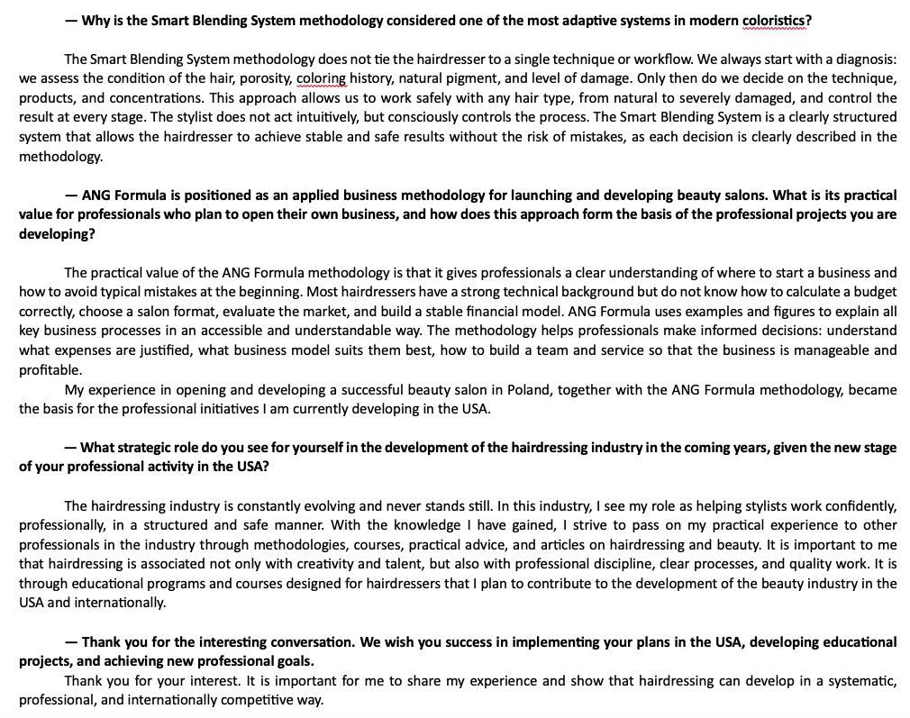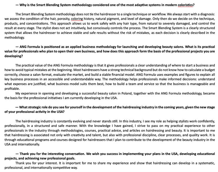 Мій досвід відкриття та розвитку успішного салону краси в Польщі, разом із методологією ANG Formula, став основою для професійних ініціатив, які я зараз розвиваю в США.