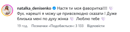 У коментарях в Анастасії з'явилася і найкраща подружка Тараса Цимбалюка — акторка Наталка Денисенко, яка неодноразово брала участь в зйомці "Холостяка".