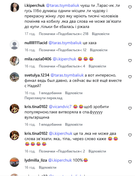 Утім прихильники проєкту розкритикували Цимбалюка у відповідь, зазначивши, що він вчинив негідно, а також "розбив серце всім жінкам, які дивились проєкт".